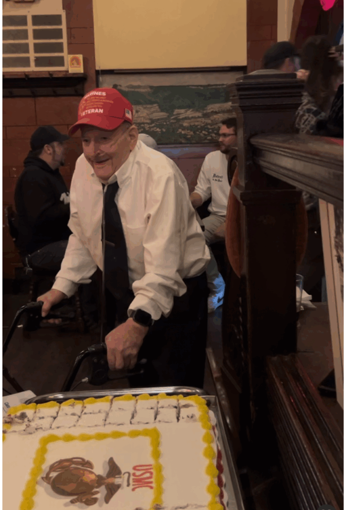 And the cake was cut, with the traditional order of serving: First slice to the guest of honor, who was the guy whose family owned the restaurant for two generations before selling it to Paddy. Second slice to the oldest Marine present, i.e., this guy, who fought at Guadalcanal: