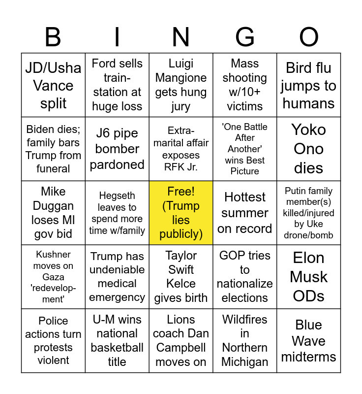 Finally, you’ve heard the expression “I did not have (astounding news event) on my bingo card,” I’m sure. Well, with the help of bingo-card generators, you too can have one. Here’s mind, from bingobaker.com: