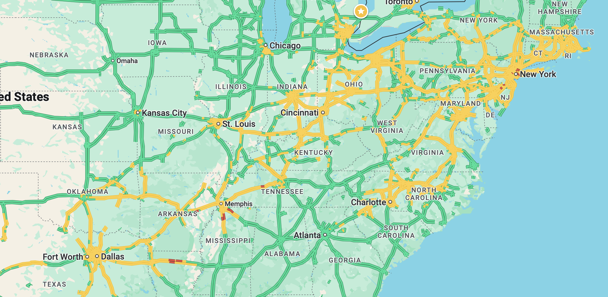 At one point, bored, I checked to see how far out you could pull a Google map and still see highway conditions. Pretty far: