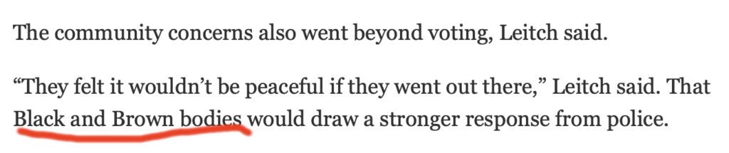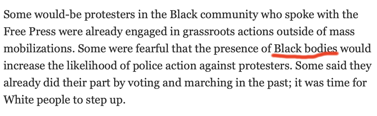 The Freep ran a weird story on Sunday, noting that the many protests against the Trump regime in Detroit last year were overwhelmingly white. No argument here; I was at most of them, and they were indeed on the pale side. But I noticed the writer using a particular usage that’s become common in recent years:
